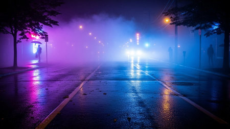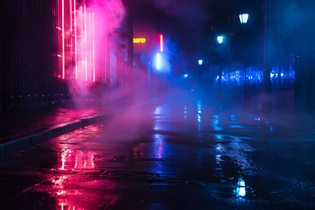 A wet street at night glows with purple and blue neon lights, reflecting on the asphalt. Fog obscures the scene,...