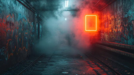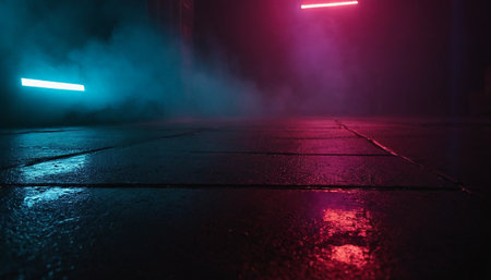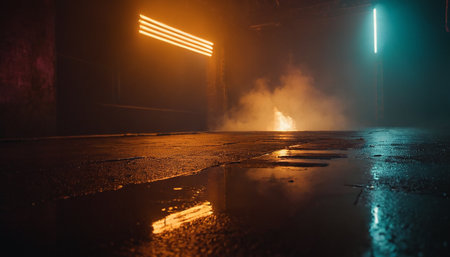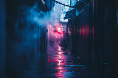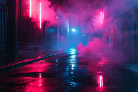 Urban alleyway with neon lighting and mysterious smoke effect