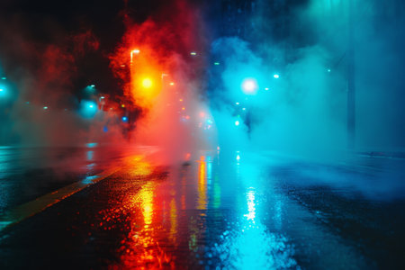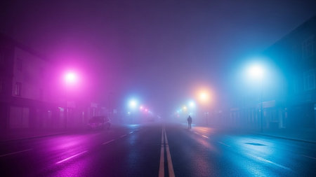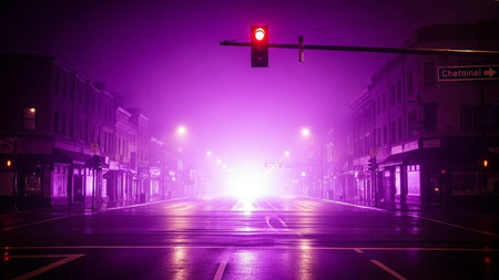 A deserted urban street intersection shrouded in thick fog, illuminated by the vibrant glow of red and blue traffic...