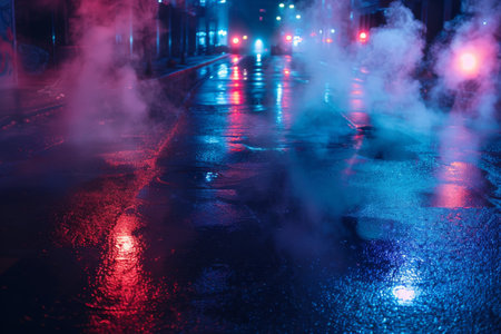 Neon lights and smoke on wet street.