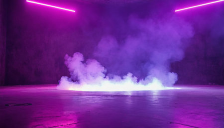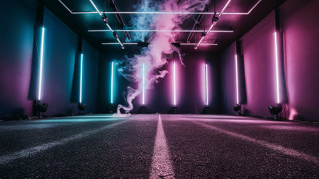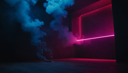 abstract scene with neon lights, smoke and fog on the floor