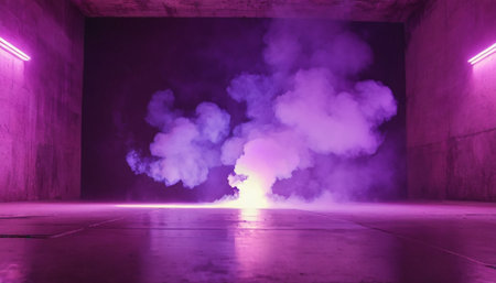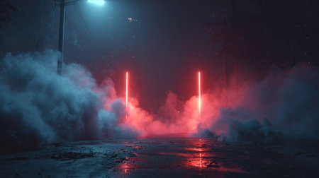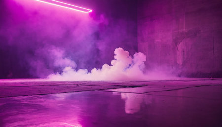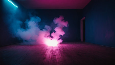 Bright neon lights in pink and blue rise from the ground, creating a stunning visual effect in a dimly lit environment filled with thick smoke. The contrast highlights the atmosphere.