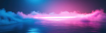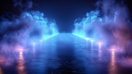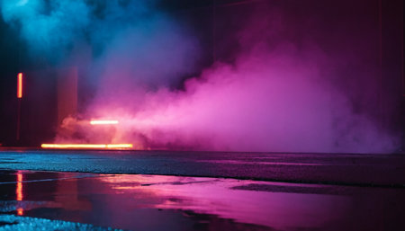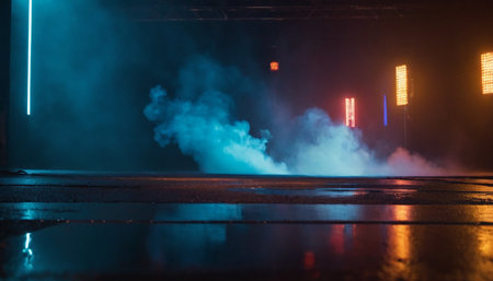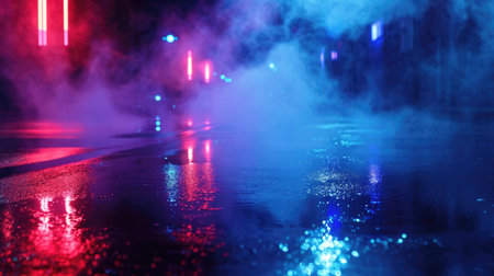 Nightlife showing atmospheric neon colored fog and mist illuminated by vibrant blue pink and green lights reflecting on a wet dark surface creating a moody urban or...