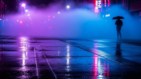 A solitary figure with an umbrella stands on a wet city street reflecting vibrant purple and blue neon lights and fog.