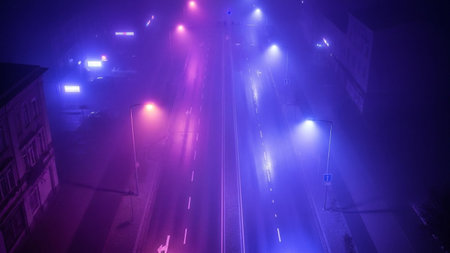 234. showing aerial view of a foggy city street at night illuminated by neon purple and pink lights. resolution...