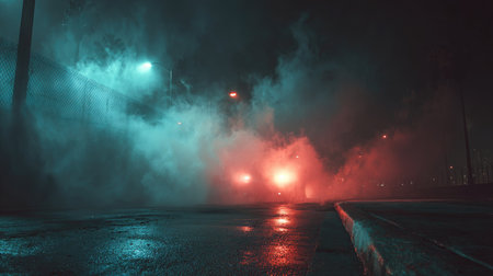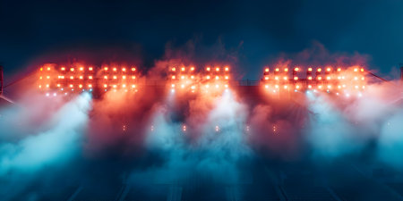 Creating a atmospheric sporting scene with vibrant stadium lights and hazy smoke. Concept Sporting Scene, Vibrant Stadium Lights, Hazy Smoke, Atmospheric Setting