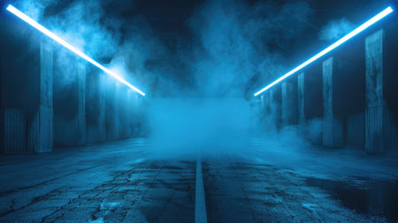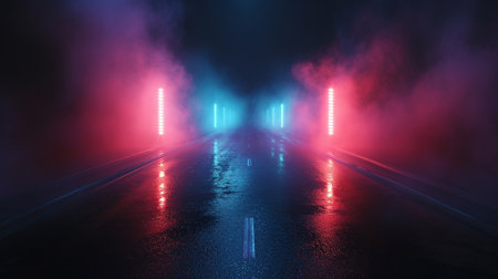 Abstract background of wet asphalt, reflection of neon lights, smoke in dark empty street. Dark space scene of empty street, scenery night city. Creativity design concept. Gen ai. Copy ad text space