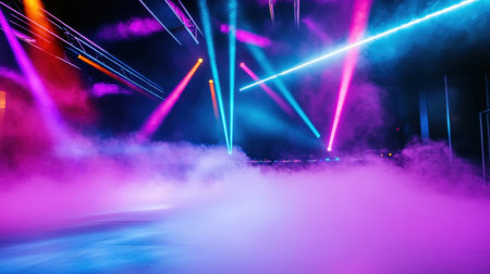 Vibrant concert stage with dramatic smoke and dynamic lighting effects