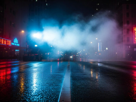 A mesmerizing night scene featuring soft neon lights and dense smoke enveloping a city road, creating an atmospheric and surreal vibe perfect for artistic endeavors.