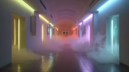 A hallway features glowing pink and blue neon lights along the walls, with smoke creating a mystic atmosphere. This modern design invites curiosity and exploration.