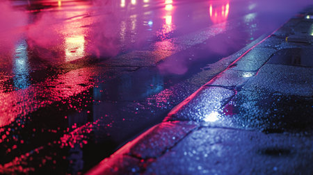 A captivating scene featuring colorful reflections on a wet pavement, illuminated by neon lights, creating a vibrant and moody atmosphere with soft mist.