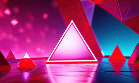 3d rendering of abstract background with neon lights and triangular shapes.