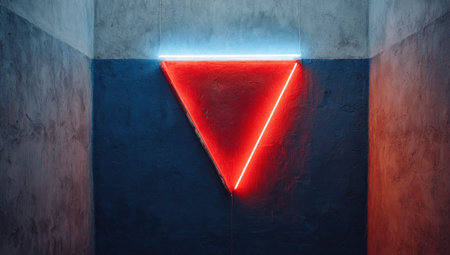 A vibrant red neon triangle glows brightly, suspended against a dark blue background. The geometric shape is framed by textured concrete walls, creating a contrasting visual composition. The image suggests a modern, interior space, potentially suitable for contemporary art or design projects. This could also be used for creative advertising campaigns.
