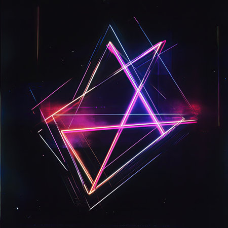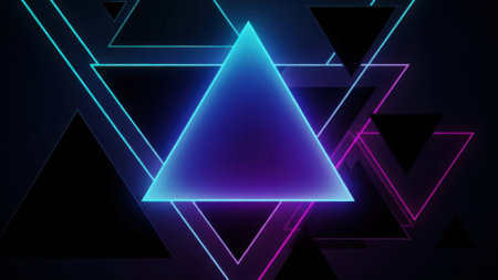 A vibrant image featuring a neon-lit triangle as the central focus. The triangle is illuminated in shades of blue and purple, surrounded by overlapping geometric shapes in various colors. The dark background contrasts with the bright, glowing lines, creating a futuristic and dynamic visual effect.