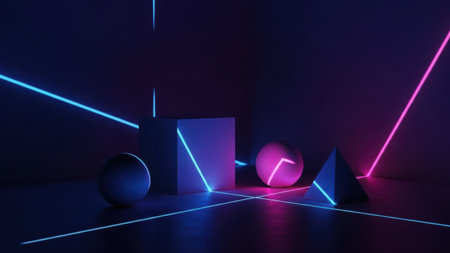 Modern showing abstract 3d geometric shapes including cubes spheres and pyramids illuminated by vibrant neon pink blue and orange lights keywords: abstract, 3d,...