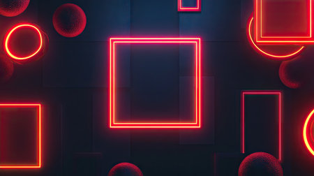 Vibrant design featuring various geometric shapes, including squares, rectangles, and circles, outlined with bright red neon light against a dark backdrop. The shapes and lighting create a dynamic and modern aesthetic. The shapes appear to be floating, or displayed against, a textured surface.