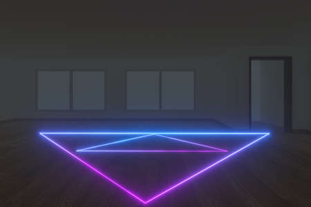An abstract neon background inside an empty room has a geometric triangular pattern
