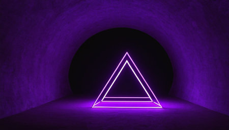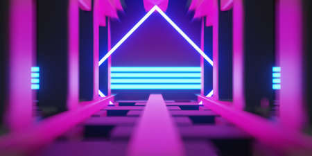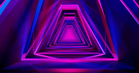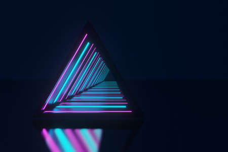 Neon triangle in dark tunnel. 3D rendering. Neon lights.