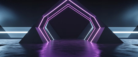 AI Generated. Abstract Geometric Archway with Neon Lights and Dark Background