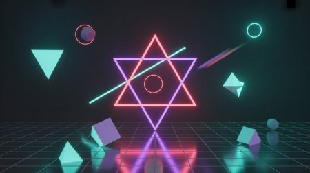 Bright geometric shapes and patterns come alive with neon colors on a sleek backdrop.