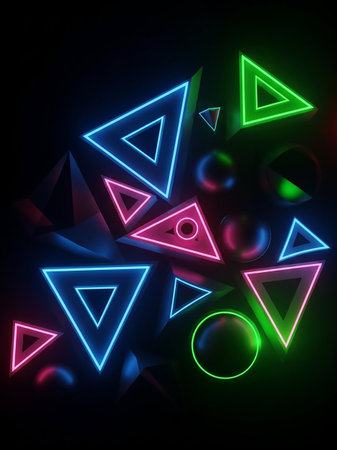 A dark background showcases a dynamic arrangement of glowing neon triangles in blue, pink, and green, interspersed with spheres and sharp geometric forms.