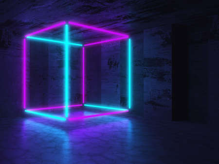 3d render. Geometric figure in neon light against a dark tunnel. Laser glow.