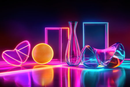 Various glass objects and geometric shapes emit vivid colors under neon lighting against a dark backdrop.