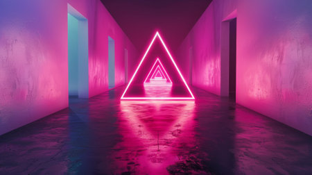 A vibrant composition showcases illuminated neon triangles reflected in water. The scene features vivid pink and purple hues, with a modern, geometric style. The lighting creates a dynamic visual effect. This image could be suitable for digital art, advertising, or design projects. Its versatile style may enhance creative applications.