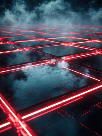 Red light grids extend across a glossy surface, reflecting the surrounding atmospheric haze, evoking a sense of advanced technology and depth.