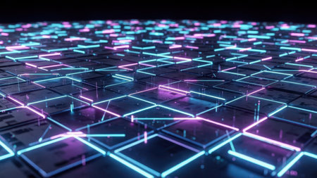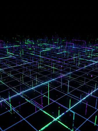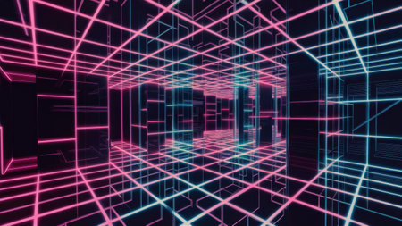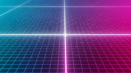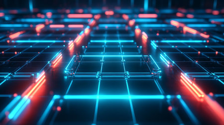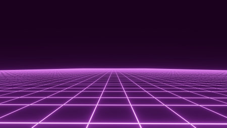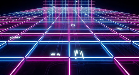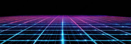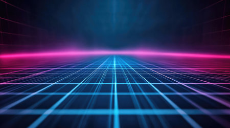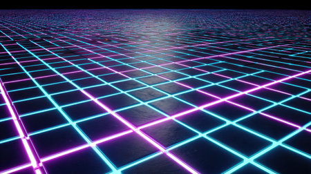 This image showcases a futuristic digital grid illuminated by neon lines against a dark background. It conveys a sense of advanced technology and infinite possibilities, ideal for creative projects.