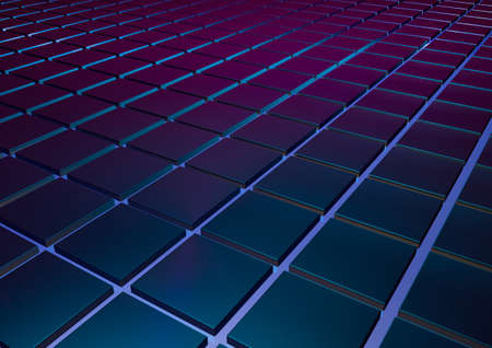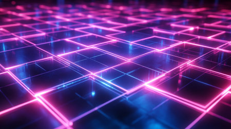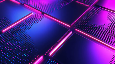 This image showcases a grid of dark squares illuminated by vibrant blue and pink neon light. The composition features a perspective view, highlighting the geometric pattern. The style is modern, with a focus on color and texture, suitable for various design projects and digital art applications.