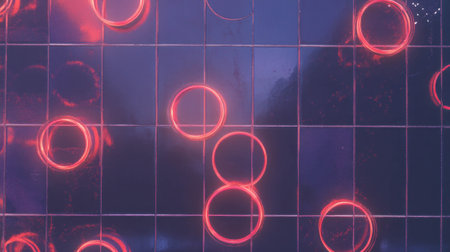 Vibrant purple tiled wall with glowing red neon circular patterns for modern design