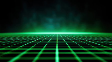This image showcases a futuristic alien landscape featuring a luminous neon green grid set against a dark, atmospheric background, ideal for sci-fi and digital projects.