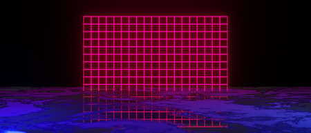3D Rendering Illustration. Futuristic Modern Grid With Purple And Blue Glowing Neon Square Shape Empty Space Wallpaper Background