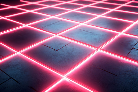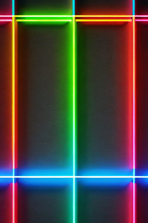 This vibrant abstract grid pattern features glossy tiles illuminated by neon lights, creating an eye-catching design ideal for modern projects.