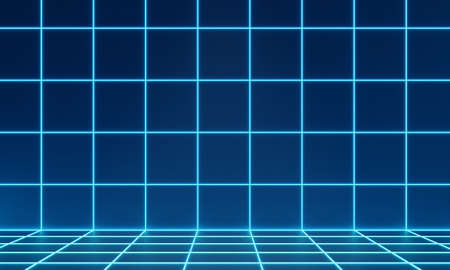 abstract 3d illustration of glowing wireframe grid with neon light effects