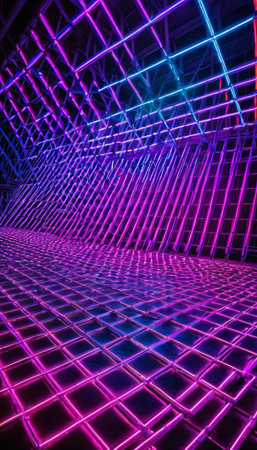 This image showcases an intricate, abstract grid pattern illuminated by neon lights in shades of blue, purple, and pink. The geometric design creates a sense of depth and complexity, with intersecting lines forming a three-dimensional effect. The vibrant colors and modern aesthetic give it a futuristic and dynamic feel.