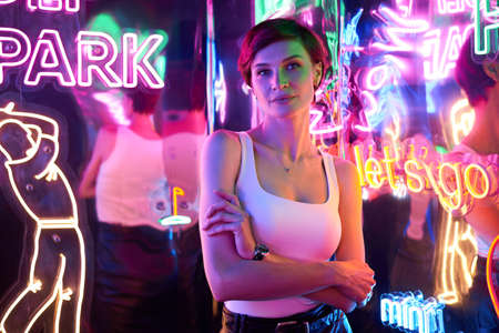 Portrait of a young attractive female standing near neon lamps at night