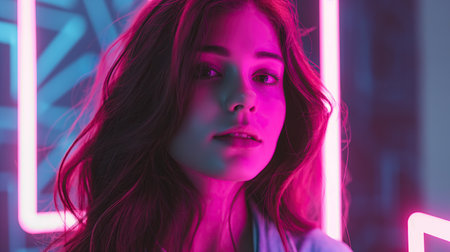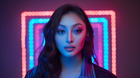 A captivating portrait of a young woman set against a backdrop of vibrant neon lights, showcasing urban nightlife and a colorful atmosphere in the city.