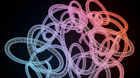 Wireframe showing tangled wireframe structure of intertwined tubes with gradient pink and blue lighting. resolution