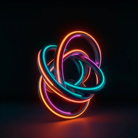A vibrant neon sculpture with intertwined rings in a dark studio setting. The sculpture is lit with colorful neon lights, casting shadows on the floor.