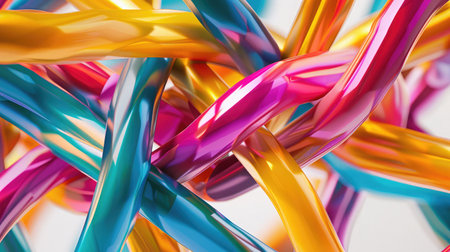 Vibrant plastic straws in various colors, braided and twisted, layered and intersecting, creating a dynamic pattern on a black background, shiny bright smooth textures.