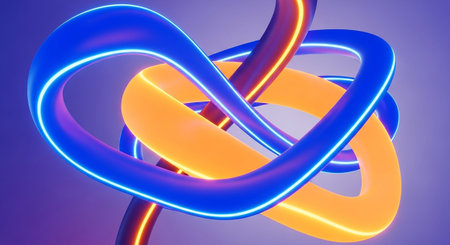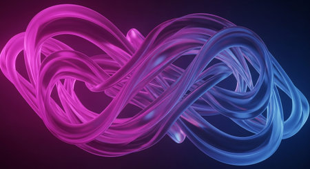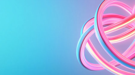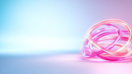A dynamic 3D render presents a complex abstract sculpture composed of numerous intertwined neon tubes. The form is intricate and fluid, suggesting motion and energy, with resembling infinity loops and helixes. The color palette a vibrant blend of pink and blue neon lights, creating a striking gradient effect against a dark background. The smooth, glossy surface of the tubes reflects the light, producing bright highlights and soft shadows that define the three-dimensional structure. This...