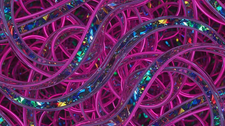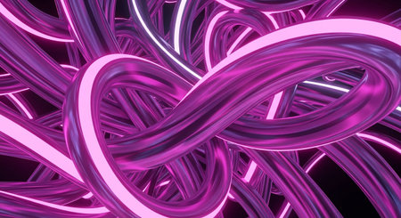 This abstract presents a dense, chaotic tangle of smooth, shiny tubes in vibrant magenta and pink hues. The forms are fluid and curved, with internal neon light creating a luminous glow along their edges. The intricate weaving of the tubes suggests complexity and interconnectedness. Against a dark, almost black background, the bright colors and glowing lines create a dynamic and energetic visual experience. This digital render is backgrounds, or abstract concepts.