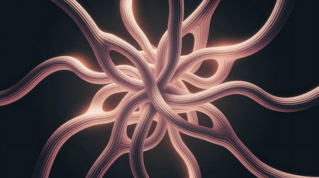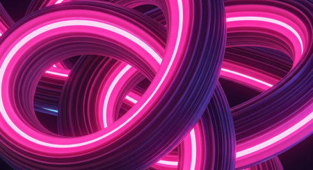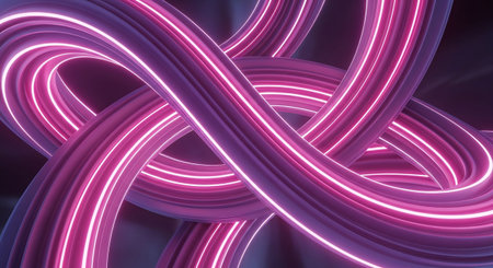 Abstract digital featuring a complex intertwining of smooth, flowing tubes. The tubes are illuminated with a vibrant neon pink glow, creating a sense of depth and energy. The background is dark and subtly textured, allowing the luminous forms to dominate the composition. The overall impression is modern, futuristic, and visually striking, with a focus on light and form.
