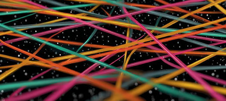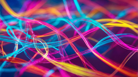The image displays an abstract composition featuring multicolored neon lines against a black background. The vibrant colors include bright green, blue, purple, red, and yellow, each intersecting in a dynamic pattern. The lines vary in thickness, creating a sense of depth and motion as they weave across the frame. Some lines appear to be glowing more intensely, adding contrast and highlighting the intertwined nature of the design. The background remains consistently dark, which enhances the bright colors of the neon lines, making them appear more vivid. Overall, the image gives an impression of energy and fluidity, reminiscent of light trails or digital art.