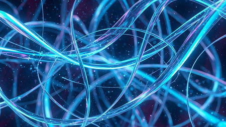 Glowing cyan tubes twisting and turning in a wavy pattern on a black background. Clear details and vibrant col...