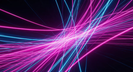 Abstract depiction of vibrant neon light trails in motion creating a dynamic energy flow effect with motion blur and a sense of speed.