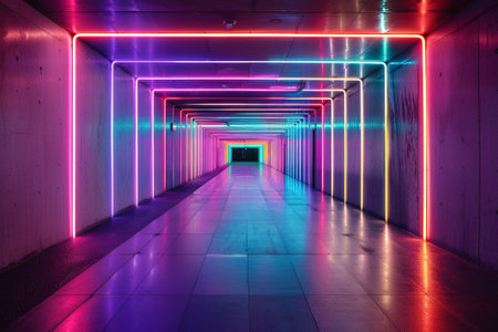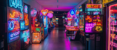 Vibrant neon signs illuminate bustling corridor in urban space