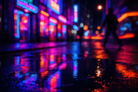 Neon City Reflections On Rainy Night Street With Silhouettes And Vibrant Signs